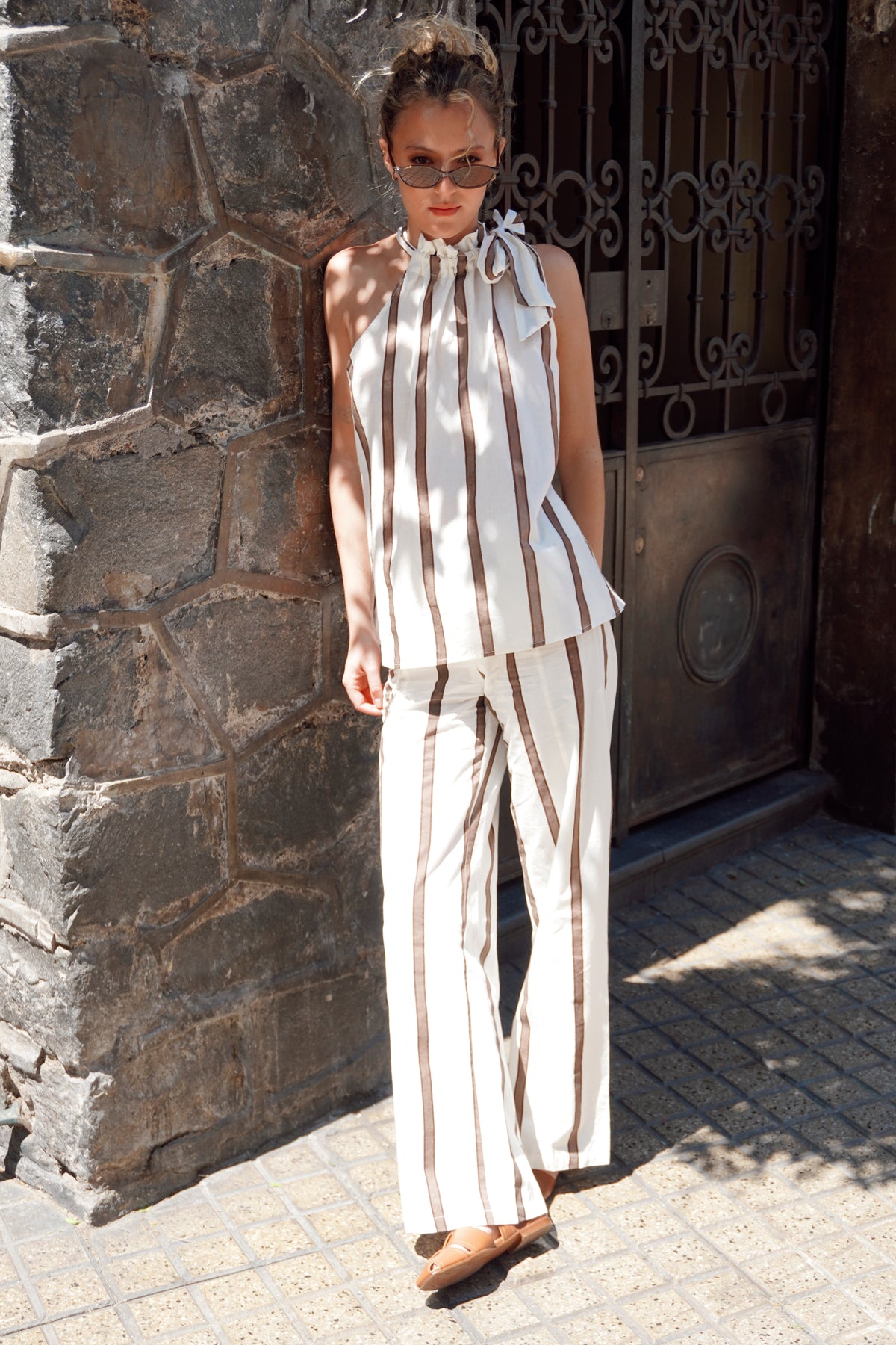 Pantalón veraniego, con pretina ancha hacia un lado y lazo para ajustarlo.